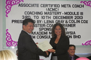 Untuk menjadi meta-coach yang berjaya, peserta dikehendaki melalui 7 sesi coaching yang dinilai. Markah minima ialah 2.5. Kursus ini dikendalikan oleh Lena Gray dan Colin Cox bersama dengan Tuan Hj Md Taib Mat (Akademi NLP Malaysia) sebagai pengelola/sponsor. Wokshop yang pertama kali diadakan di Malaysia ini berjaya menghasilkan 30 meta-coach. Tahniah untuk semua yang terlibat.